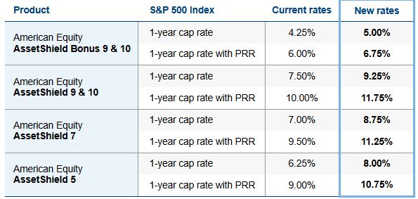 Effective today, Jan. 5, 2026, we are increasing rates for our American Equity AssetShield fixed index annuities. Impacted products and their updated rates are shown below.