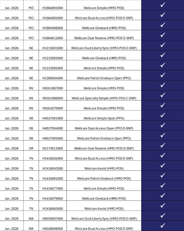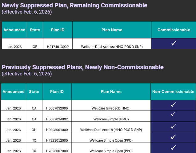 - One plan, Wellcare Dual Access in Oregon (H2174013000), will be suppressed beginning Feb. 6, 2026, but will remain commissionable.
