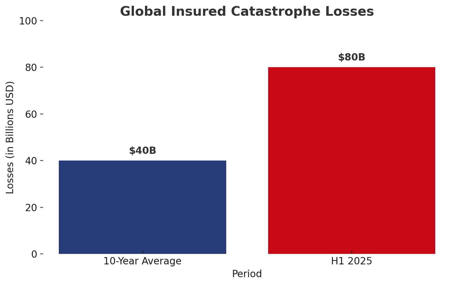Non-life insurers are facing mounting exposure to severe weather. The first half of 2025 alone brought $80 billion in insured natural disaster losses, nearly double the 10-year average. Convective storms in the U.S. accounted for $31 billion of that total.